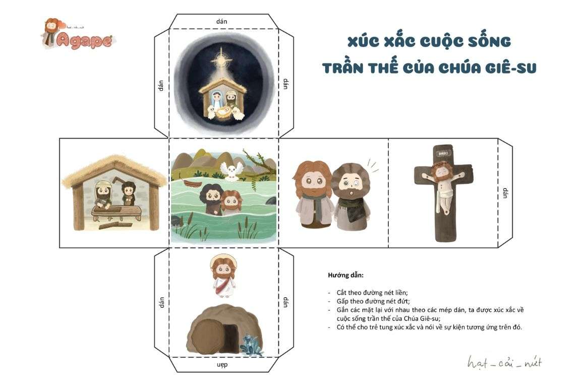 - Gắn các mặt lại với nhau theo các mép dán, ta được xúc xắc về cuộc sống trần thế của Chúa Giê-su;